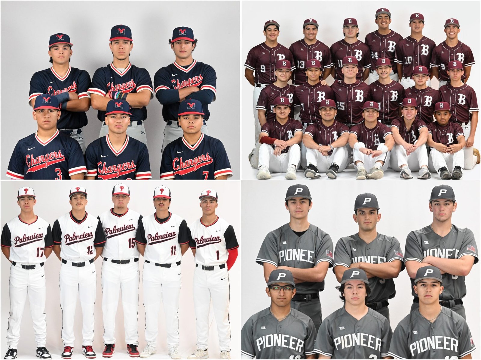 Brownsville Veterans (top left), PSJA High (top right), La Joya Palmview (bottom left), and Sharyland Pioneer at RGV Baseball Media Days. Photos by Andrew Cordero – Special to RGVSports.com.